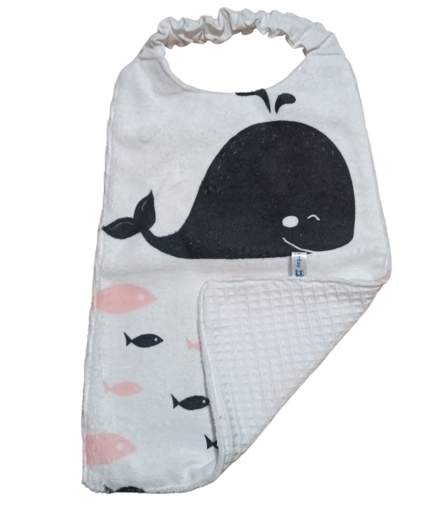 Serviette avec un élastique facile a mettre par l'enfant, elle est en eponge devant et en éponge nid d'abeille derrière.