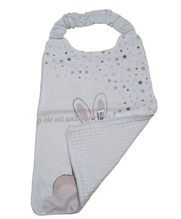 Serviette avec un élastique facile a mettre par l'enfant, elle est en eponge devant et en éponge nid d'abeille derrière.